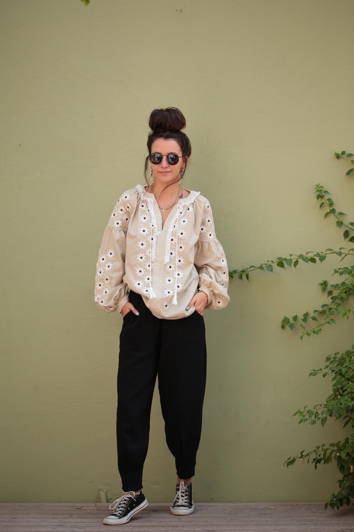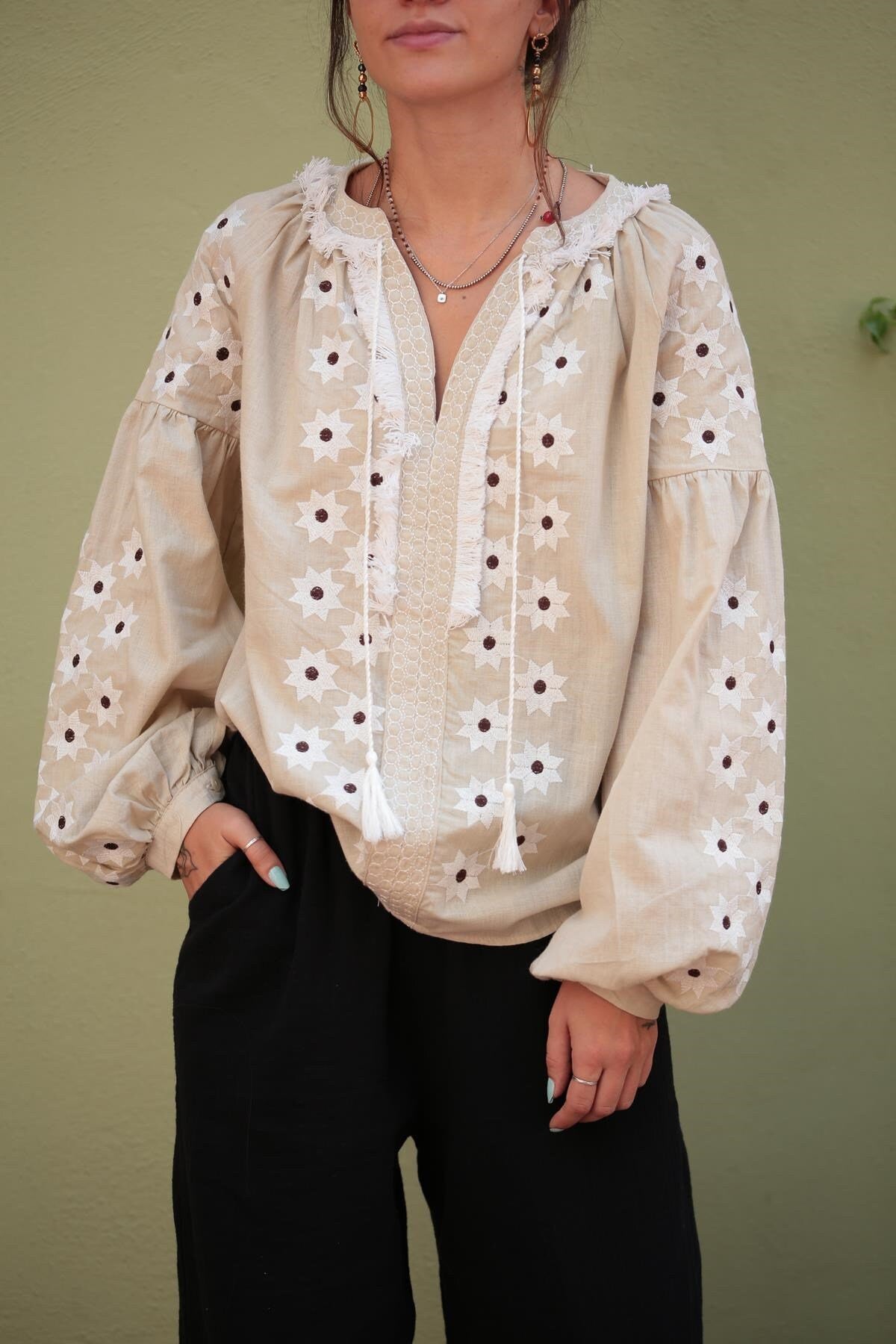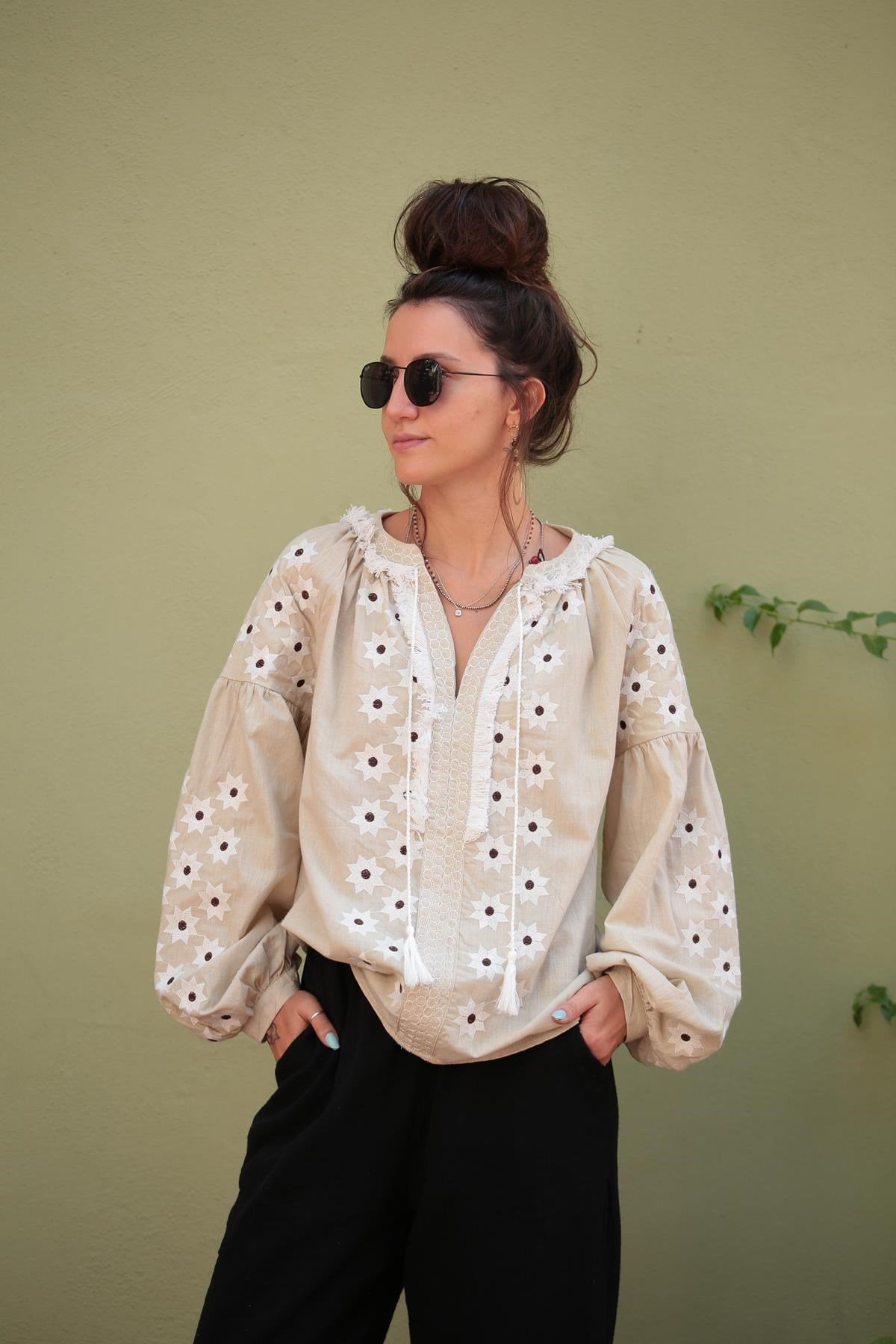 Η κρεμ ουκρανική Vyshyvanka με κέντημα σε σχήμα λουλουδιού και αστεριού είναι κάτι περισσότερο από ένα απλό ένδυμα—είναι ένα κομμάτι ιστορίας που επαναπροσδιορίζεται για τη σύγχρονη γκαρνταρόμπα. Προσθέστε αυτήν την όμορφη μπλούζα στη συλλογή σας και φέρτε μαζί σας το πνεύμα της ουκρανικής δεξιοτεχνίας.