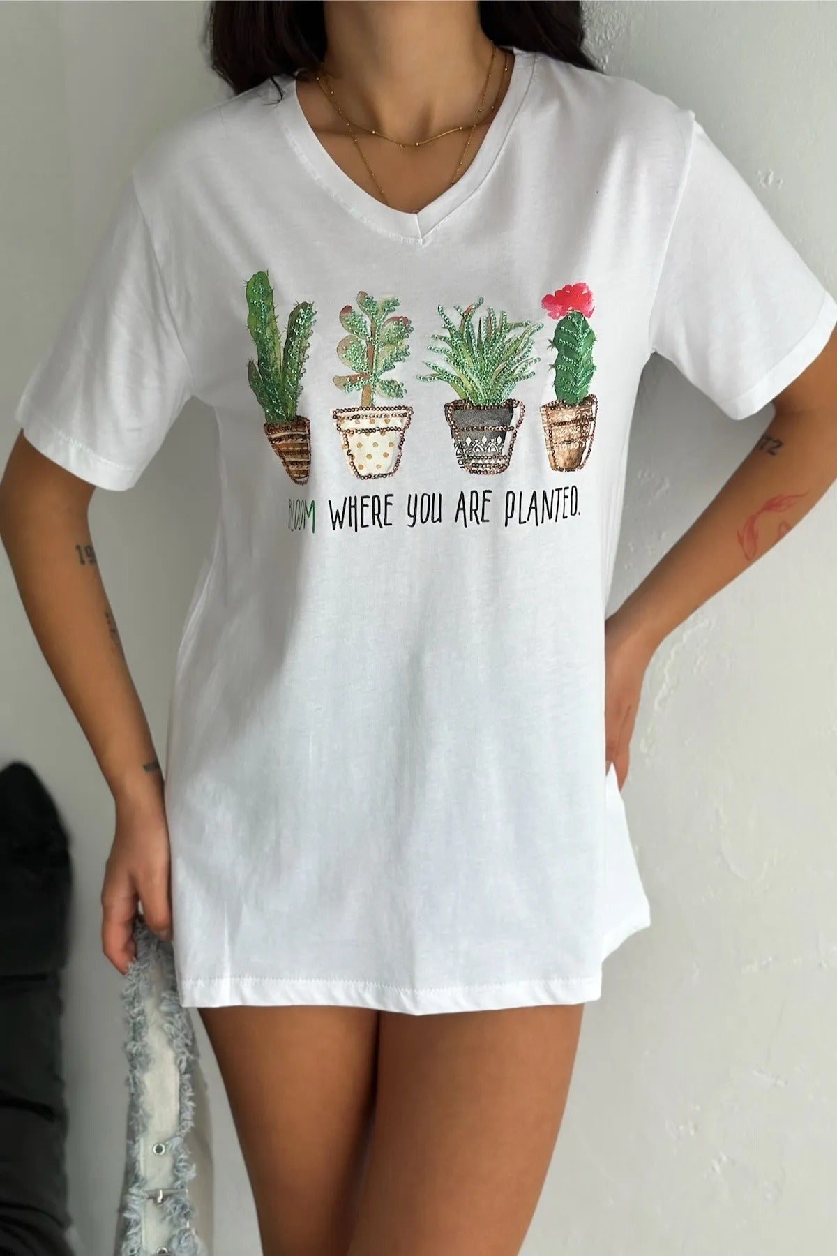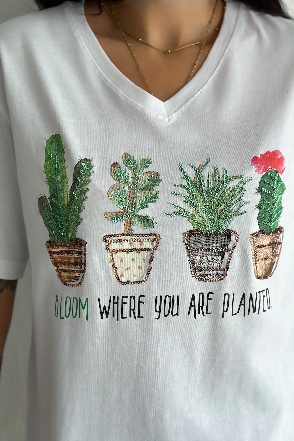 Tilda Kaktüs Çiçekli Payetli Pamuklu Tişört - Beyaz