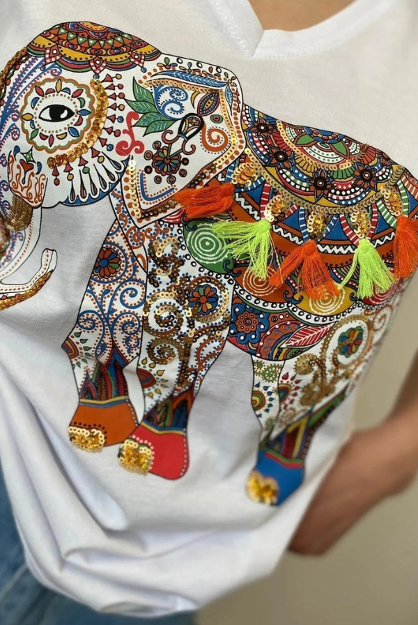 Tilda Fil Desenli Çiçek Payetli Pamuklu Tişört - Beyaz