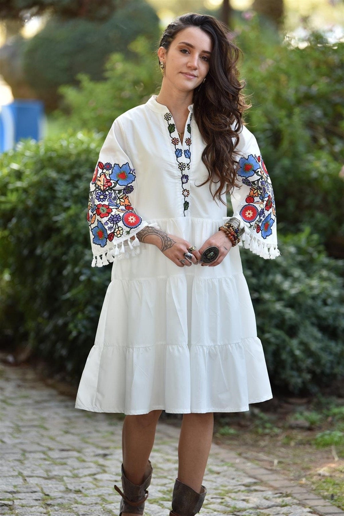 Beyaz Çiçek İşlemeli Elbise